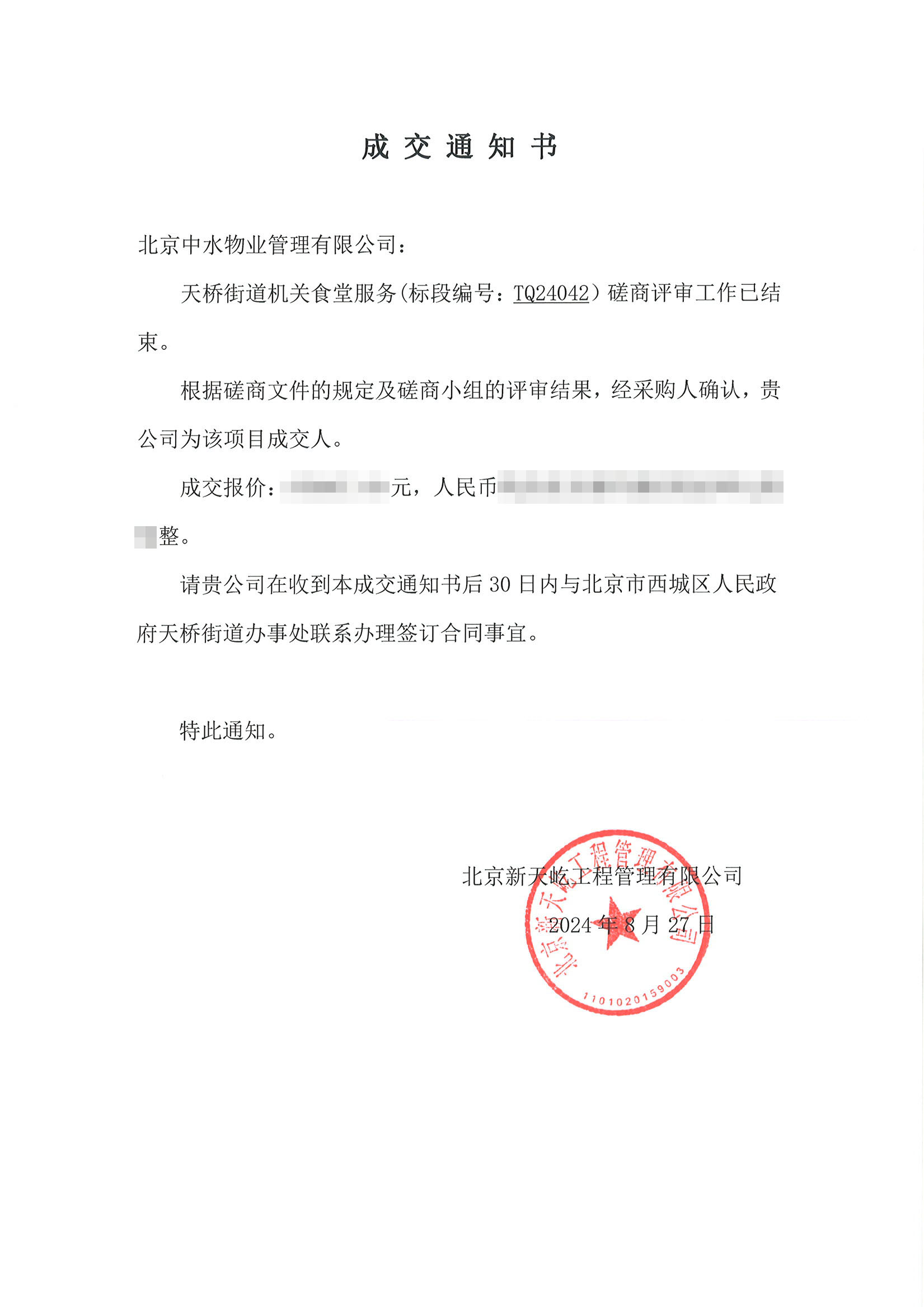 中水物业成功中标天桥街道机关食堂服务项目