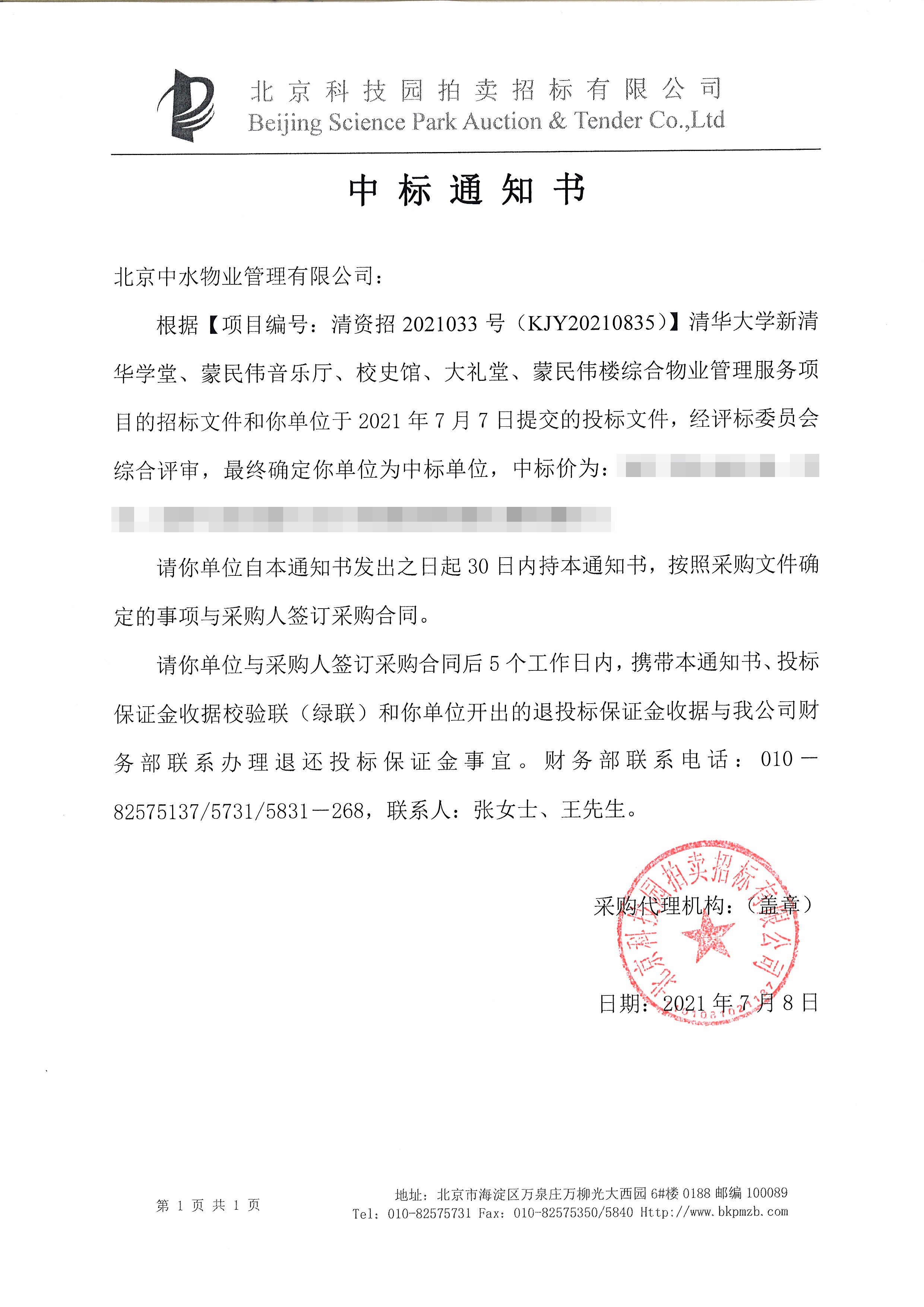 清华大学新清华学堂、蒙民伟音乐厅、校史馆、大礼堂、蒙民伟楼综合物业管理服务项目成功中标