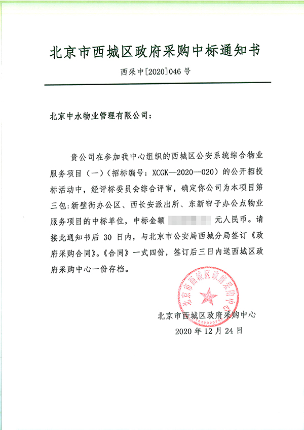 新壁街办公区 、西长安派出所 、东新帘子办公点物业服务项目成功中标