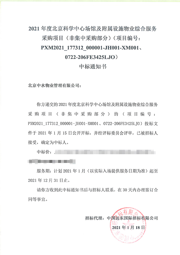 2021年度北京科学中心场馆及附属设施物业综合服务采购项目(非集中采购部分)成功中标