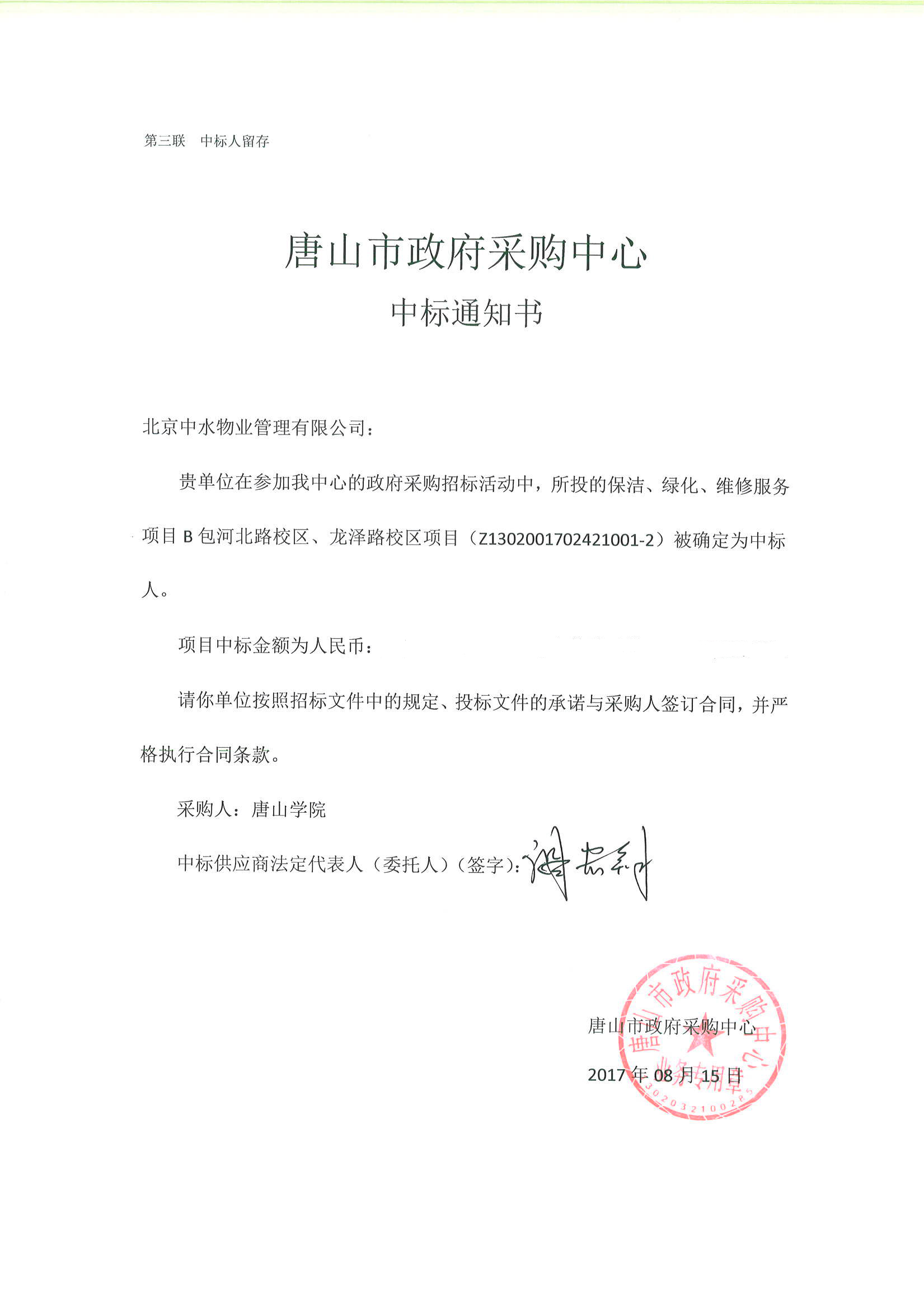 唐山市河北路校区、龙泽路校区保洁、绿化、维修服务项目成功中标