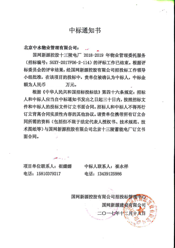 国网新源控股十三陵电厂2018-2019年物业管理委托服务项目成功中标