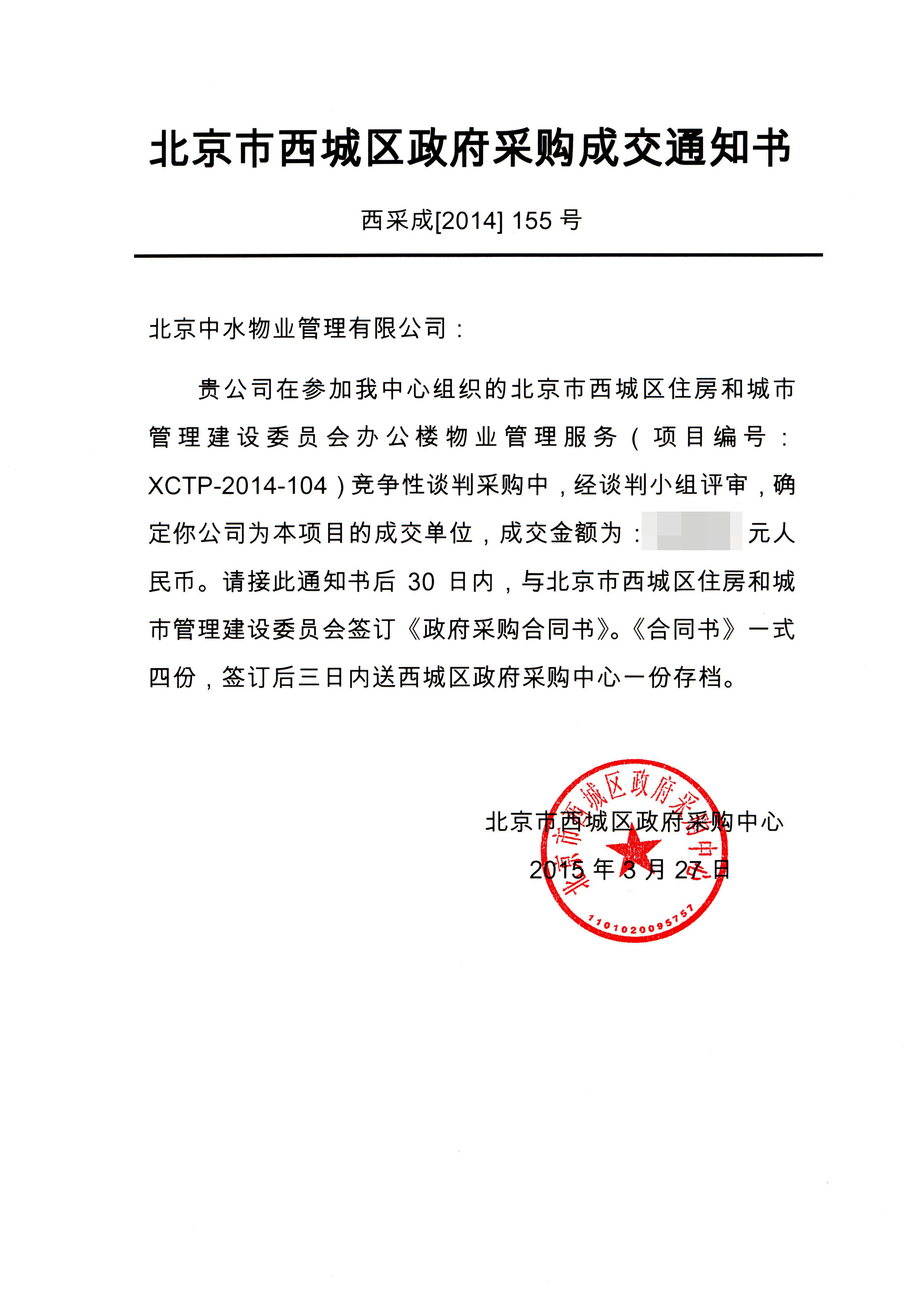 北京市西城区住房和城市管理建设委员会办公楼物业管理服务竞争性谈判采购项目成功中标