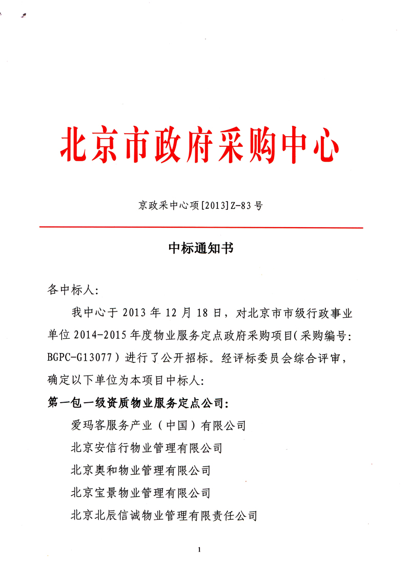 成功入围北京市市级行政事业单位2014-2015年度物业服务定点采购供应商