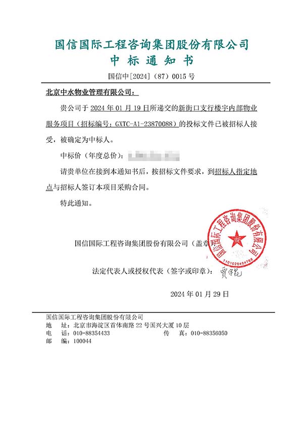 中水物业成功中标新街口支行楼宇内部物业服务项目